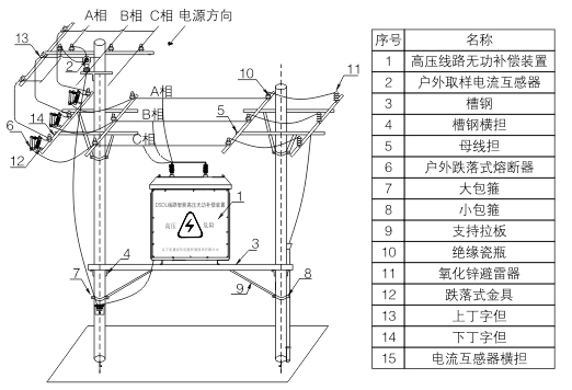 TBBZ系列高壓線路無功補(bǔ)償裝置主要由控制器,真空接觸器,電容器,電壓互感器,綜合保護(hù)器等組成。系統(tǒng)通過線路開啟式電流互感器采集線路電流信號(hào),分析判斷線路無功功率缺失容量,控制電容器組的投切,使功率因數(shù)達(dá)到設(shè)定目標(biāo)值。裝置采用戶外跌落式熔斷器對(duì)進(jìn)行短路保護(hù),一旦裝置有短路故障,跌落式熔斷器立即跳開,防止對(duì)裝置和線路造成損害。