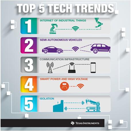 在迎接2015到來之際,我們有必要花時間來評估和預(yù)測未來的一年中將會出現(xiàn)的技術(shù)挑戰(zhàn)和突破創(chuàng)新。通過與眾多戰(zhàn)略客戶、大學(xué)合作伙伴以及TI產(chǎn)品線的技術(shù)專家進(jìn)行探討后,我們認(rèn)為TI將在一些重要技術(shù)趨勢中發(fā)揮戰(zhàn)略性作用。這些技術(shù)趨勢正推動著汽車和工業(yè)等多個市場的發(fā)展,而在此過程中,TI的工程師將幫助應(yīng)對半導(dǎo)體技術(shù)領(lǐng)域的獨(dú)特挑戰(zhàn),并利用先進(jìn)技術(shù)改善我們的生活。
